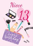 Front of card: Boyfriend Birthday Photo Upload Card Illustration of a Make up bag with various make up items around the card. Text reads: "Niece 13 Happy Birthday". 'Niece & 13' can be personalised!