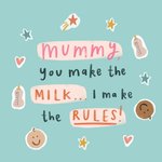 Featuring playful hand-drawn text surrounded by baby bottles, stars, hearts, and smiling baby face illustrations, all on a light teal coloured background.