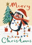 Featuring a cute penguin illustration with a face photo upload area, wrapped in colourful fairy lights, on a peach coloured snowy background with a Christmas tree, presents & script text.
