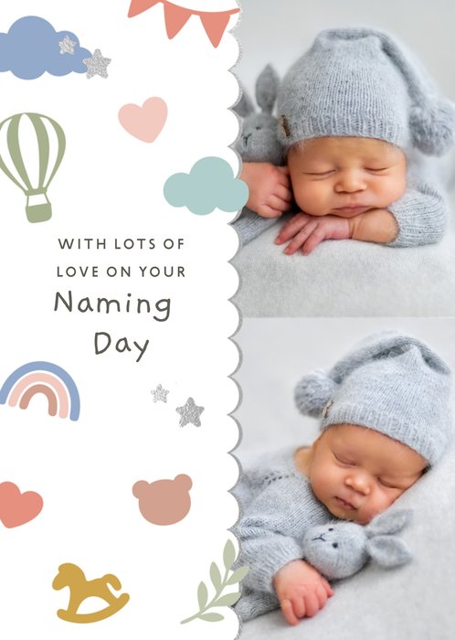 Featuring pastel bunting, hearts, clouds, stars, a rainbow and playful baby icons beside two, large photo frames, on a white coloured background.
