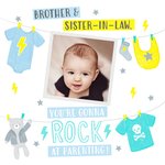 Features illustrations of rock and roll themed baby clothes hanging on a washing line. In the centre of the card is a photo upload.