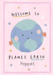 Featuring a cute illustrated smiling planet Earth with tiny hands surrounded by stars, hearts and a crescent moon on a soft pink coloured background.