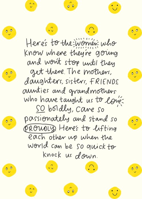 Featuring a handwritten message celebrating women, surrounded by yellow smiley faces on a cream background.