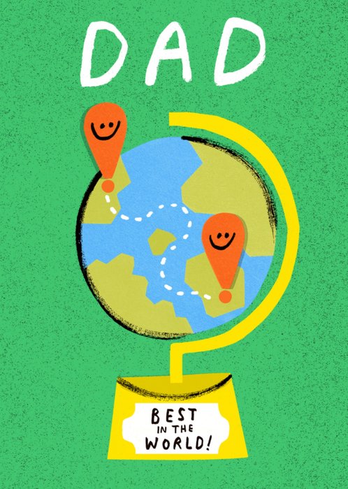 A bright and cheerful greeting card showing a globe with smiley location pins and a dotted travel path, topped with the word “Dad” and a golden base reading “Best in the World!” — perfect for a long-distance hug in card form.