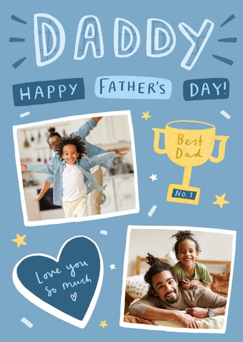 Featuring photo frames arranged into the word 'Dad' surrounded by stars on a blue background.
