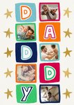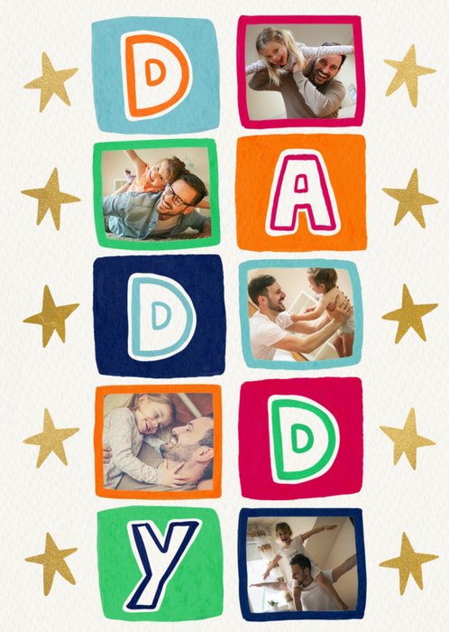 A bold and vibrant card featuring 5 photo upload frames, the word "Daddy" spelt out in playful, hand-drawn block letters surrounded by colourful squares with 5 gold foil stars on either side, all on a textured white background.