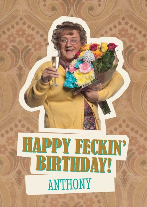 Danilo Mrs Brown's Boys. The design has a photo of Mrs Brown that sits on top of a retro brown patterned background. The caption reads non editable Happy Feckin' Birthday! Editable recipients name.