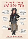 This edgy birthday card celebrates a daughter’s gothic style with a hand-drawn outfit featuring a leather jacket, mesh skirt, and skull tee. Playful annotations highlight details like layered jewellery and stompy boots. A textured background enhances the alternative vibe, while a circular photo cutout adds personalisation.