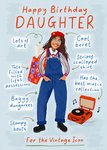 This artistic birthday card celebrates a vintage-loving daughter with a hand-drawn outfit featuring a beret, dungarees, and stompy boots. Playful annotations highlight artistic details like a tote and record player. A textured background enhances the retro feel, while a circular photo cutout personalises the design.