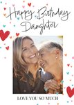 Featuring a large, rectangular photo upload area in the centre of the card, surrounded by a confetti of coloured hearts. There is elegant script font at the top of the card and typewriter style font at the bottom.