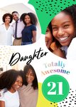 This vibrant greeting card design features a mix of abstract green and yellow patterns, black speckles, and three photo upload areas—two irregular shapes in the top left and right corners, and one oval shape near the bottom. The text “Daughter” is prominently displayed in black script, with “Totally Awesome” in a gradient effect, and a bold “21” in a green circle near the bottom right.