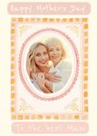 Featuring one oval photo area inside a pink scalloped frame with a soft watercolour border and hand-lettered banners on a cream background.