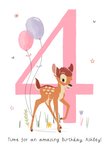 A sweet Birthday card featuring a hand-illustrated Thumper sitting in front of a huge, purple-coloured number one with two balloons coming out from behind it, one yellow and one pink. There are tiny illustrated flowers, love hearts and stars in the background.