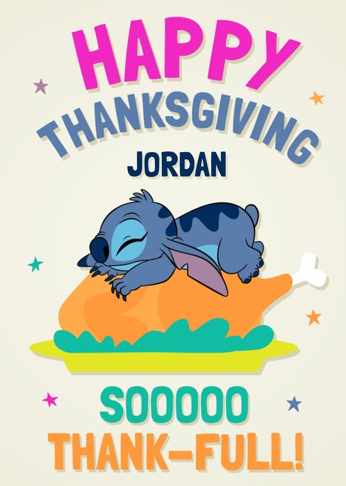 Front of card: Featuring an illustration of Stitch and a Thanksgiving turkey. Text reads: "Happy thanksgiving Jordan sooooo thank-full!". 'Jordan' can be personalised!