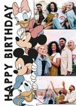 This delightful greeting card features a collage-style design. At its centre, the phrase “HAPPY BIRTHDAY” stands out in bold, cheerful yellow font. Surrounding the text are beloved Disney characters: Daisy Duck, Mickey Mouse, and Donald Duck.