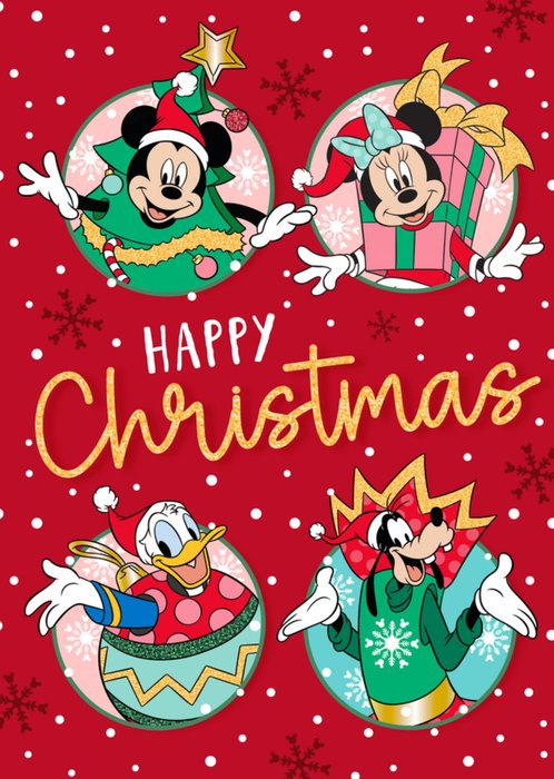 A Disney greeting card with Mickey Mouse, Minnie Mouse, Donald Duck and Goofy shown in four festive circular panels with snowflakes and polka dots on a bright red background.