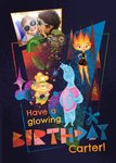 Front of card: Disney Pixar Elemental Photo Upload Birthday Card Featuring Ember Lumen, Wade, Lutz and Clod. Text reads: "Have a glowing birthday Carter!". 'Carter!' can be personalised!