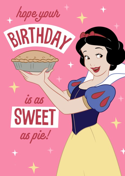 A delightful Disney Snow White-themed birthday card featuring the classic princess holding a freshly baked pie. The card has a charming pink background with twinkling stars and playful typography. A perfect choice for Disney lovers who enjoy a touch of nostalgia and sweetness on their special day.