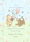 Featuring an illustration of Pooh, Tigger & Piglet playing with balloons, on a soft green & blue background with colour, polka dots & hearts, with delicate typography above and below.