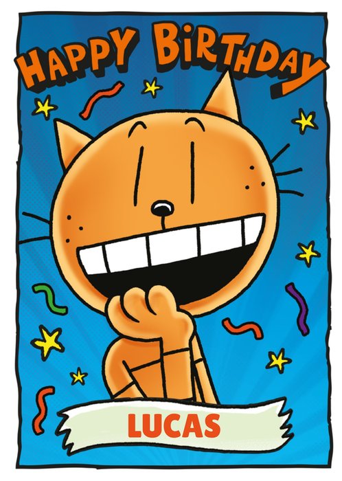 Featuring Petey the Cat with a huge toothy grin and one paw held to his chin, surrounded by colourful confetti streamers and yellow stars, with a cream ribbon banner at the bottom for a name, on a bright blue background.