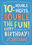 Front of card: Featuring bold vibrant typography on a blue background. Text reads: "10: double digits, double the fun! Happy birthday! Jordan". 'Jordan' can be personalised!