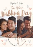 Front of card: Two large photo upload areas along with large gold handwritten wedding message, surrounded by gold and silver coloured hearts. Editable names at the top of the card. All on a cream background. Text reads: "Sophie & Luke. On your Wedding Day" With customisable names.