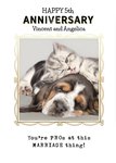 Front of card: Cute photo of a kitten lying over a dog’s head licking its fur. The photo has an illustrative elegant gold coloured frame. Anniversary message above and below in black typewriter style text and editable Happy 5th and names all on a white background. Text reads:"Happy 5th Anniversary Vincent and Angelica." With customisable names and Happy 5th.
