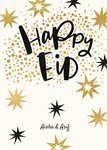 Front of card: Gold and black coloured stars and gold coloured spots surrounding large handwritten text. Text reads:"Happy Eid Aisha & Asif" With customisable names.