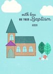 Front of card: Illustration of a church and trees on a blue background with message above and editable name. Text reads:"With love on your baptism Aiden". With ¬customisable name.