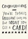 Front of card: Black handwritten typography with editable name on a cream background. Text reads:"Congratulations Jeremy. You’re totally brilliant every day but today you get a card! " With customisable name. Back of card: Pigment logo. Moonpig logo.