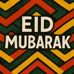 A modern design featuring bold white Eid Mubarak lettering over a colourful chevron pattern on a black background.