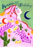 This ‘Eleanor Bowmer’ greeting card features a brightly coloured, artistic design of a woman with long, flowing, wavy pink hair looking up. Amongst her hair are illustrations of natural elements such as moons, stars, foliage and cacti.