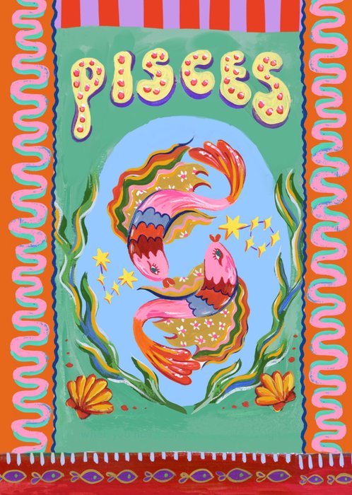This Eleanor Bowmer greeting card design features a fun and bright illustration of 7 ladies of a wide range of ethnicities, some of the ladies have bright fun hair colours such as pink and blue, there is also a lady wearing a head scarf covering her hair.