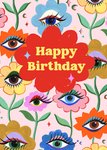 This ‘Eleanor Bowmer’ greeting card features a retro, brightly coloured design of illustrated flowers with an eye in the centre of the flower. There is yellow text set on a red, scallop edged, floral shape in the centre of the card.