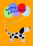 A playful Eleanor Bowmer birthday card featuring a happy Dalmatian with colourful balloons tied to its tail against a bright orange background, with a fun handwritten-style birthday message.