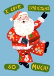This ‘Eleanor Bowmer’ Christmas greeting card design features a joyful Santa Claus dancing in a festive red outfit adorned with holiday-themed patterns such as gingerbread men, snowmen, and Christmas trees, set against a light blue background with the text “I Love Christmas So Much!” written in bold green banners.