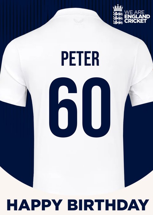 This greeting card features the back of a white England cricket shirt with a large number, the England Cricket logo, and a navy patterned background.
