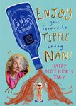 A humorous and playful Mother’s Day card for a nan, featuring an illustrated upside-down sherry bottle pouring out a lively splash, with a fun gold-text message. A photo upload area is positioned in the bottom left within a golden splash shape.