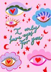 Featuring an illustration of 5 eyes with red hearts in the centre of the pupils, surrounded by moons & stars on a pink background. Blue 3D script effect typography sits in the centre of the card.
