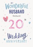 Front of card: Wedding Anniversary Card Fancy typography surrounded by colourful hearts on a white background. Text reads: "My Wonderful husband Richard on our 20th wedding anniversary". 'Husband', 'Richard' and '20th' can be personalised!
