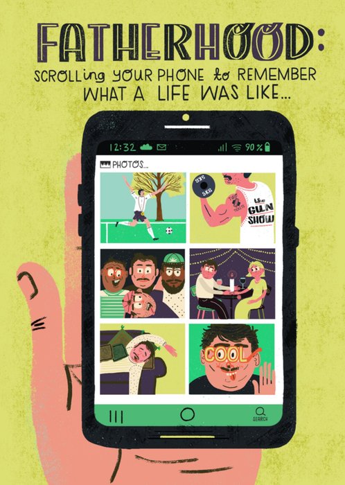 This humorous Father's Day card shows an illustrated phone screen with a photo gallery app open, filled with comical images of a dad's past life—playing football, flexing muscles, hanging with mates, going on romantic dates, sleeping on the sofa, and wearing "cool" glasses. The nostalgic theme playfully highlights how fatherhood changes priorities and lifestyle. The background is a vibrant yellow-green, making the colourful illustrations pop.