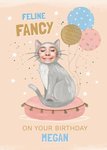 Front of card: Featuring an illustration of a cat with a face upload frame resting on a pillow surrounded by balloons. Text reads: "Feline fancy on you birthday Megan". All text can be personalised!