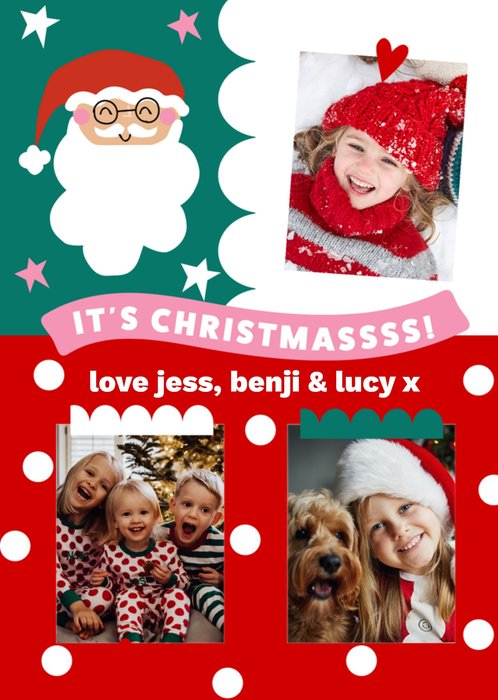 A bold and cheerful Christmas card featuring three photo upload areas and an illustrated Santa Claus.