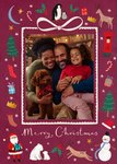 Featuring a single central photo upload frame bordered in cream scalloped edges, surrounded by illustrated festive elements including penguins, holly, presents, stockings, reindeer, Christmas trees, a post-box, Santa, a polar bear and snowman, all set against a deep burgundy background.