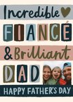 A colourful and heartfelt Father's Day card featuring warm, hand-lettered typography in mixed fonts and earthy tones. The message celebrates both a wonderful fiancé and a brilliant dad. A photo upload frame is placed neatly alongside the design, making this a personalised way to honour a loving partner and father.