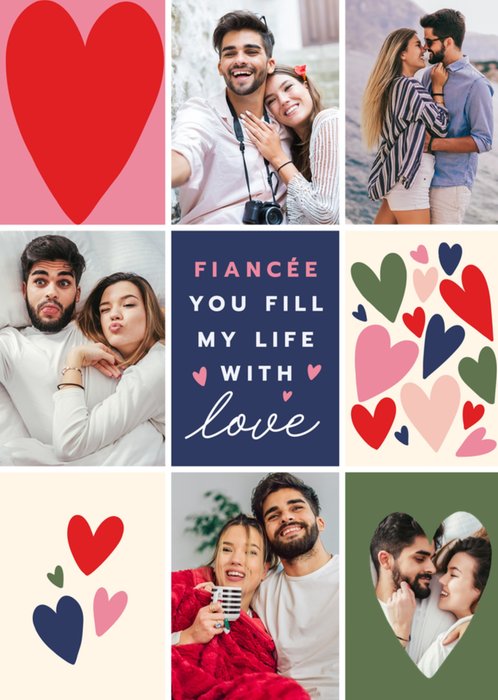 Featuring a collage design of 9 blocks in total, 5 of which are photo upload areas and the others containing small & big colourful love hearts with bold & script effect typography in the centre block of the card.