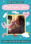 A sweet and sentimental photo upload card for a mum celebrating her first Mother's Day. The design features a vibrant blue background with adorable baby-themed illustrations, including a baby bottle, bib, rainbow, and heart.