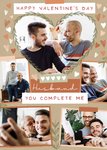 Front of card: Husband's Photo Upload Valentine's Day Card Five photo frames surrounded by hearts and foliage. Text reads: "Happy Valentine's Day Husband you complete me". '