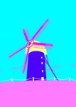Pink, yellow, blue silhouette illustrated Windmill.