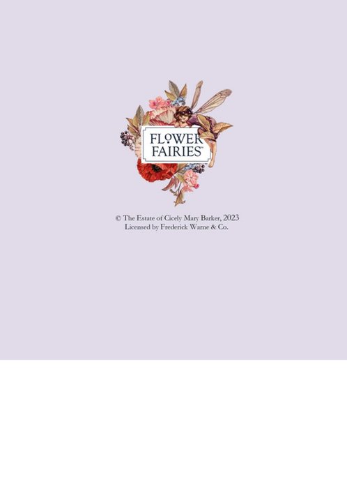 Front of card: Flower Fairies Photo Upload Birthday Card Illustration of a flower fairy among flowers with a hexagonal photo frame. Text reads: "With Love Mum on your birthday". 'Mum' can be personalised!